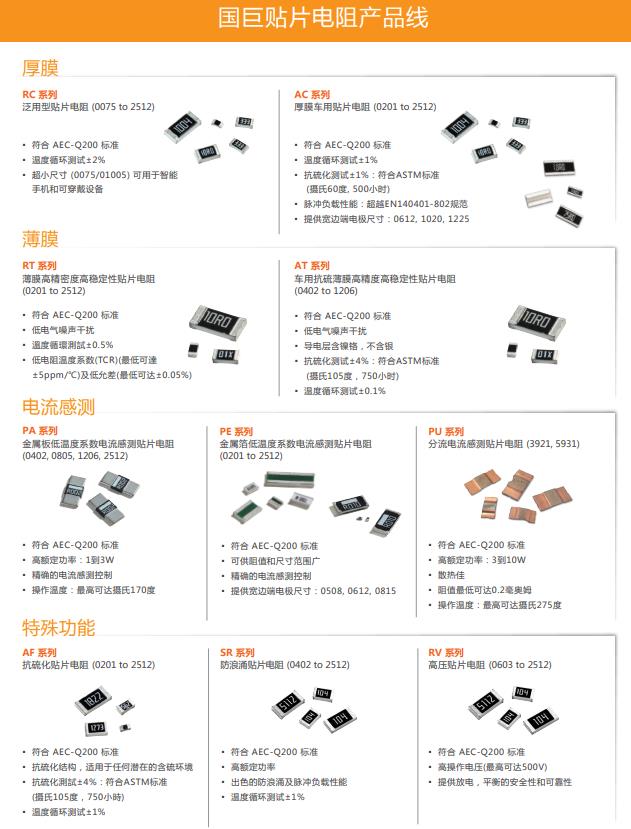 國巨是全球最大的貼片電阻供應商之一,在汽車、工業、替代能源和消費電子等主要市場鄰域提供各種應用。國巨提供完整貼片電阻產品系列,涵蓋汽車級金屬電流測電阻、精密薄膜電阻、厚膜防浪涌電阻、抗硫電阻、高功率電阻、高電壓電阻、排阻、小型010050075等,全方位解決方案。