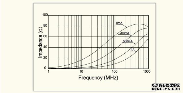 圖1是電流通過片狀鐵氧體磁珠時的阻抗值的變化示例。