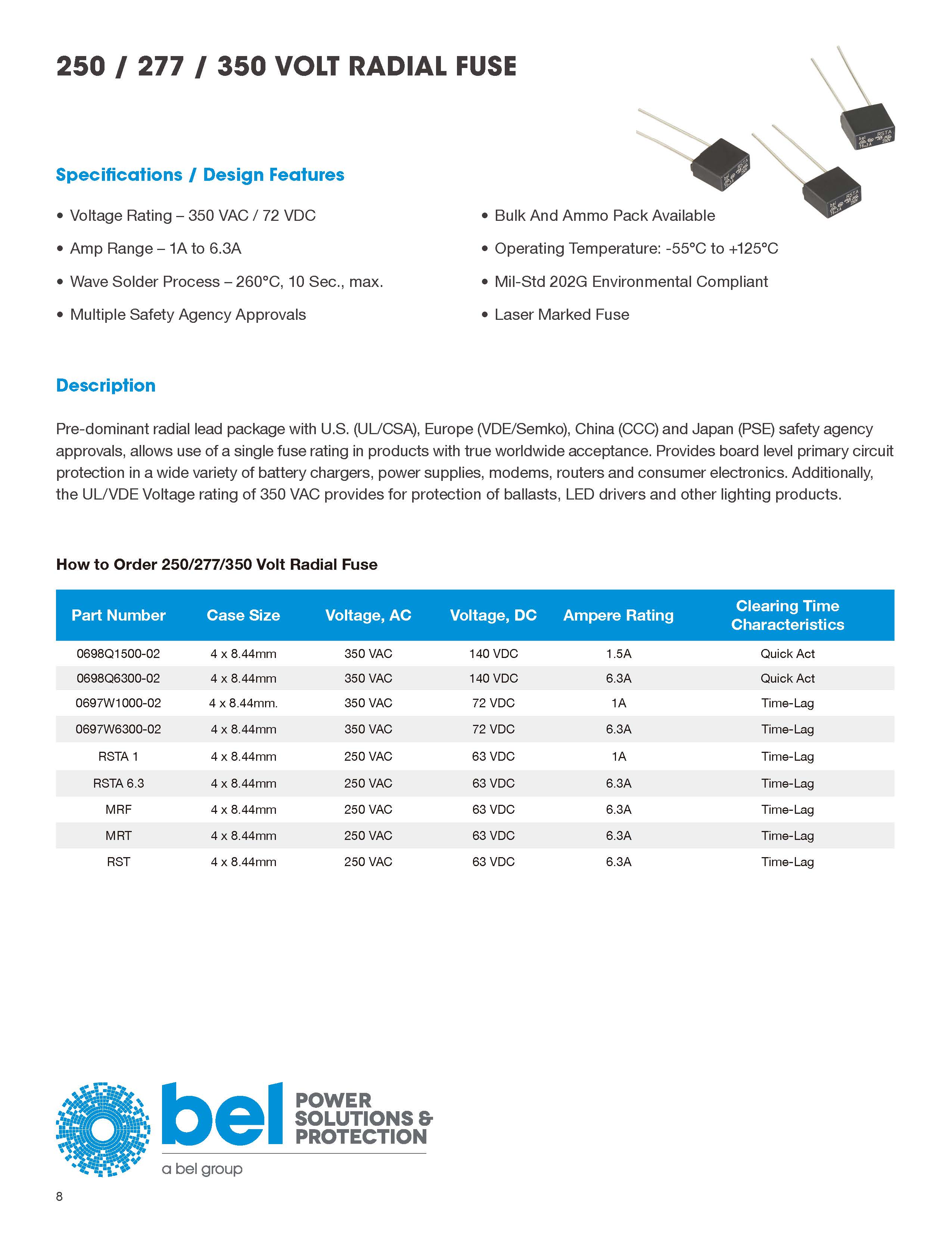 與美國,歐洲(VDE / SEMKO),中國(CCC)和日本(PSE)安全機構的預先顯性徑向鉛包裝批準,允許使用具有真正全球驗收的產品中的單一保險絲等級。 提供板級主電路在各種電池充電器,電源,調制解調器,路由器和消費電子產品中保護。 此外,350 VAC的UL / VDE額定等級可提供鎮流器,LED驅動器和其他照明產品的保護。