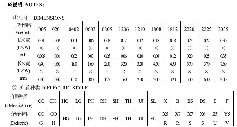 風華高科電容材質與規格尺寸對照表